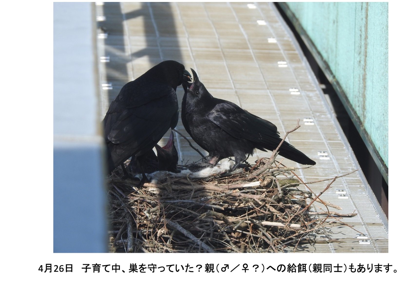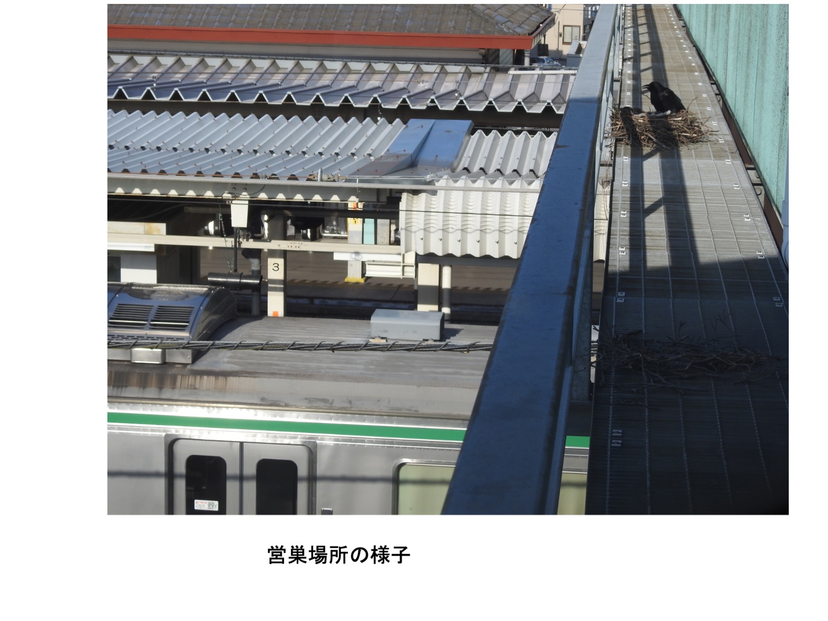 ハシボソガラスは、電柱は鉄塔、春先まだ葉もつけない落葉樹など、外部からは確認容易な場所に良く巣を造ります。 この記録の対象であるハシボソガラスの親鳥はなんと東北線の某駅舎のホーム間の高架陸橋の作業用側路に営巣しました。通路の床鉄格子に枠枝を上手く編み込み巣が固定されています。