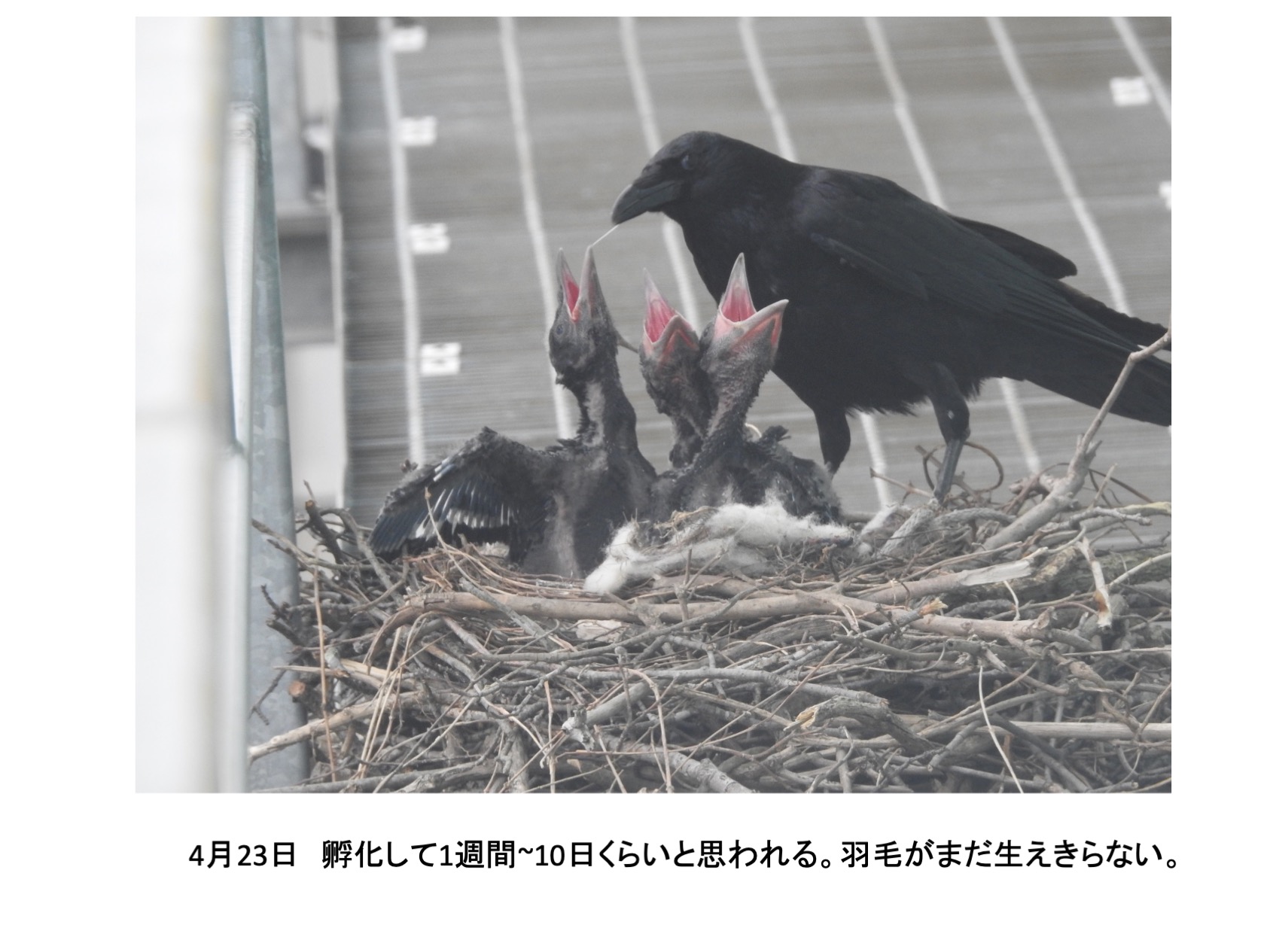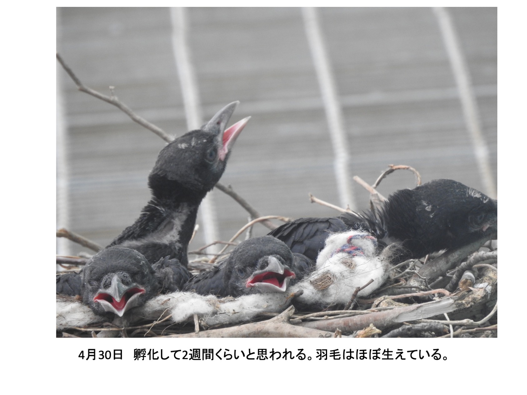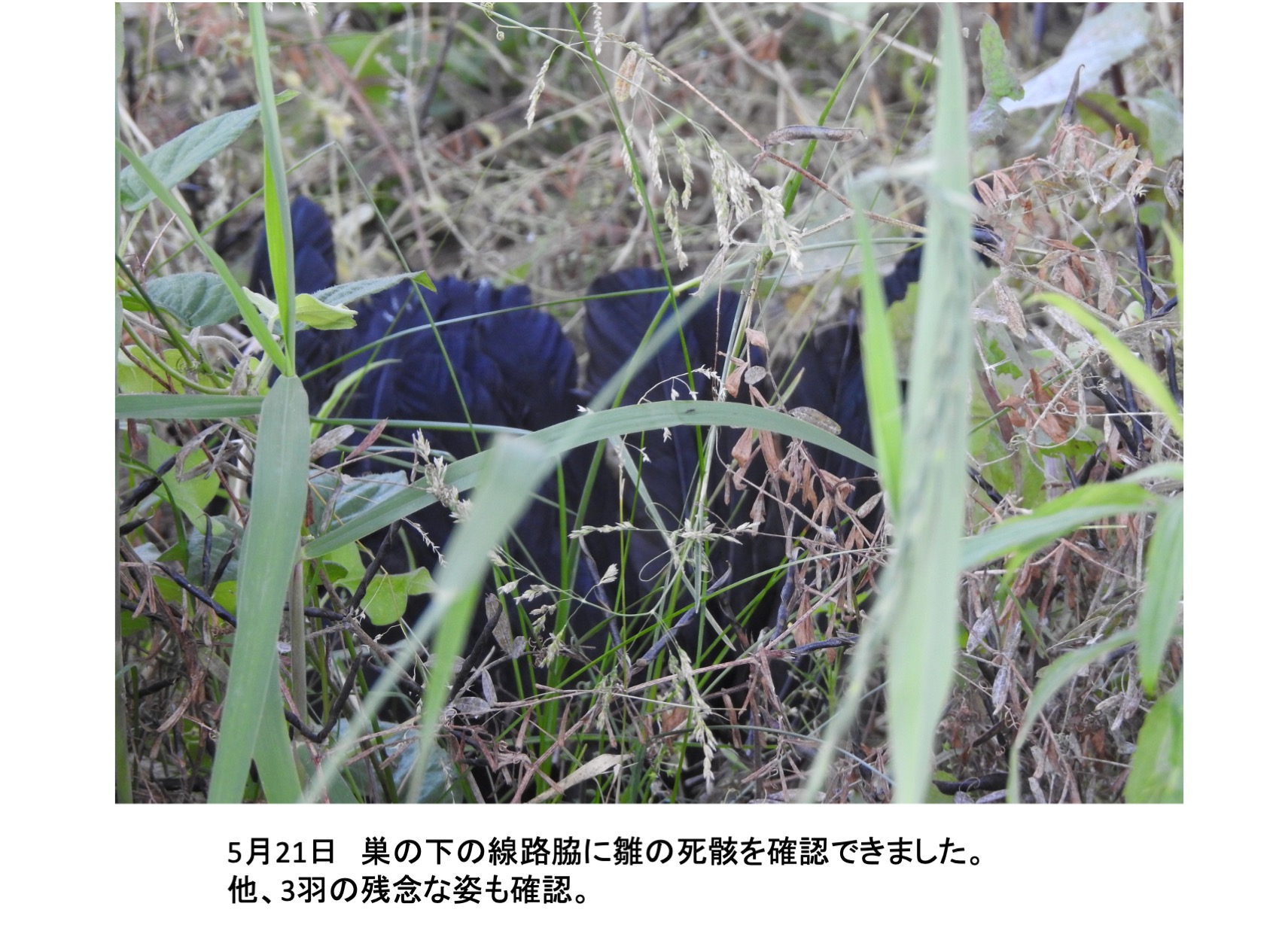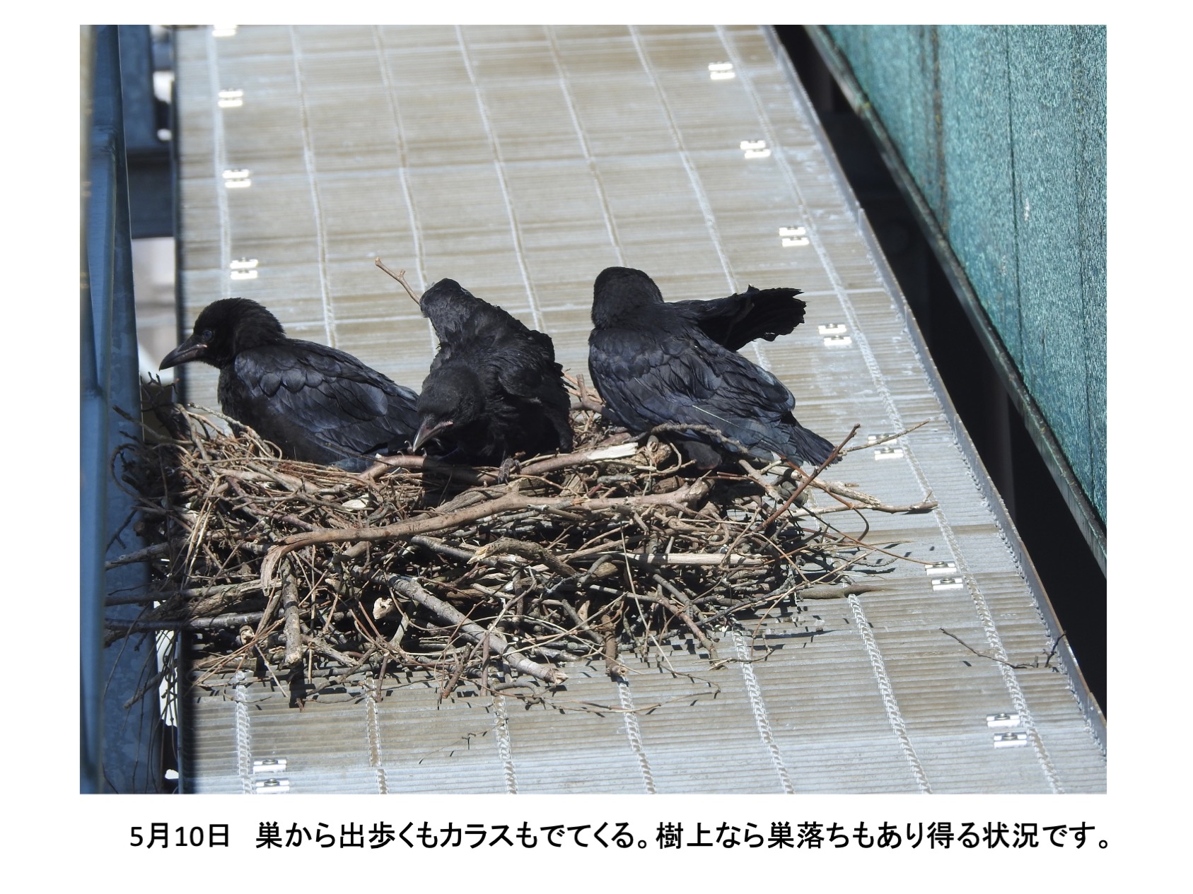 そんな、巣の中に4羽の雛がいました。確認できたのは推定孵化後1週間後くらいからです。巣立ちを期待し数日おきに観察していました。しかし、結果的には、4羽とも巣立ちができませんでした。実は、育ちは順調でしたが、育つにつれ巣から出歩いて全て落下して線路脇で衰弱死という顛末です。活発に巣からでて歩き、下を覗き見る雛を見て落下もしくは飛翔の練習で地面に降り戻れなくなるのではと思っていましたが、予想したとうりでした。高層マンションから幼児が落下する事故がたびたびですが、読み切れないことが起きるのはカラスも人間社会も同じです。