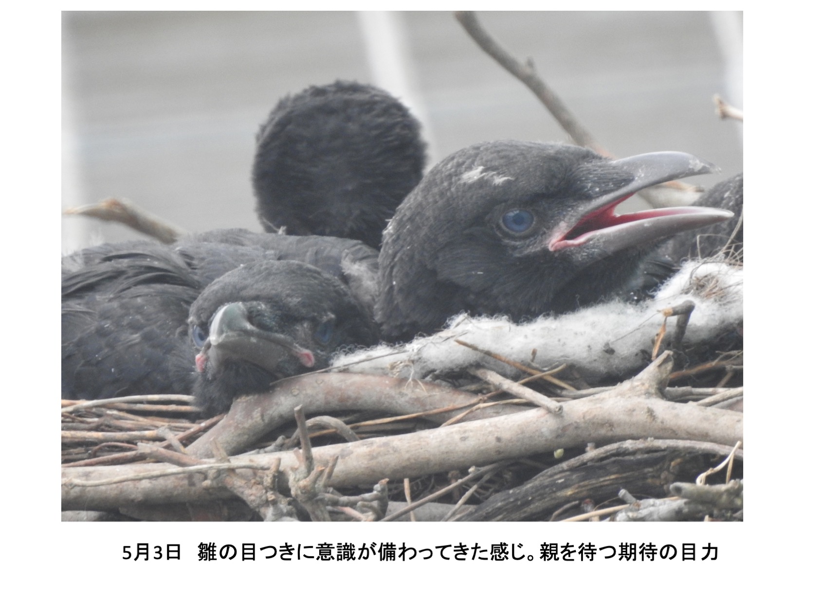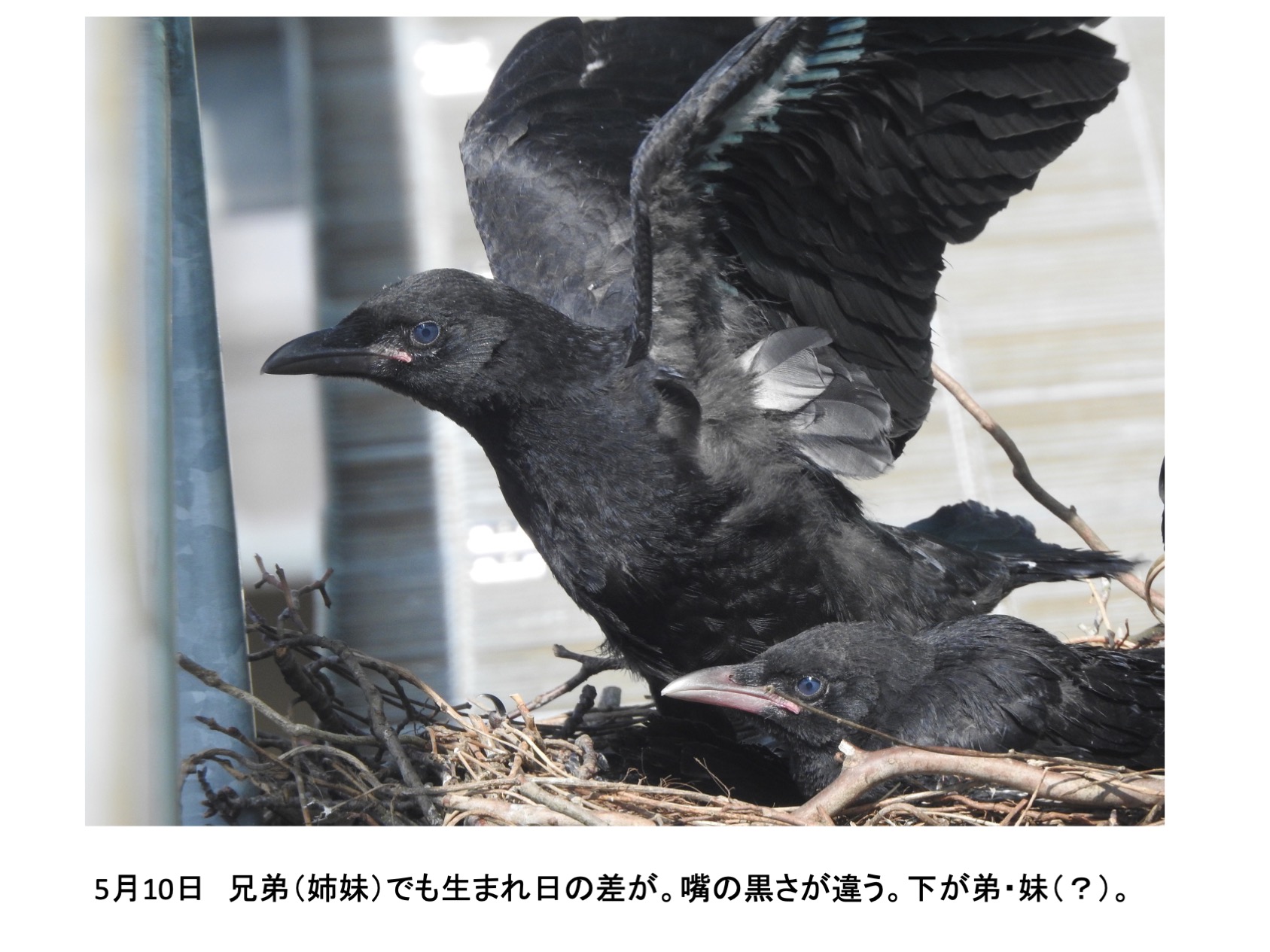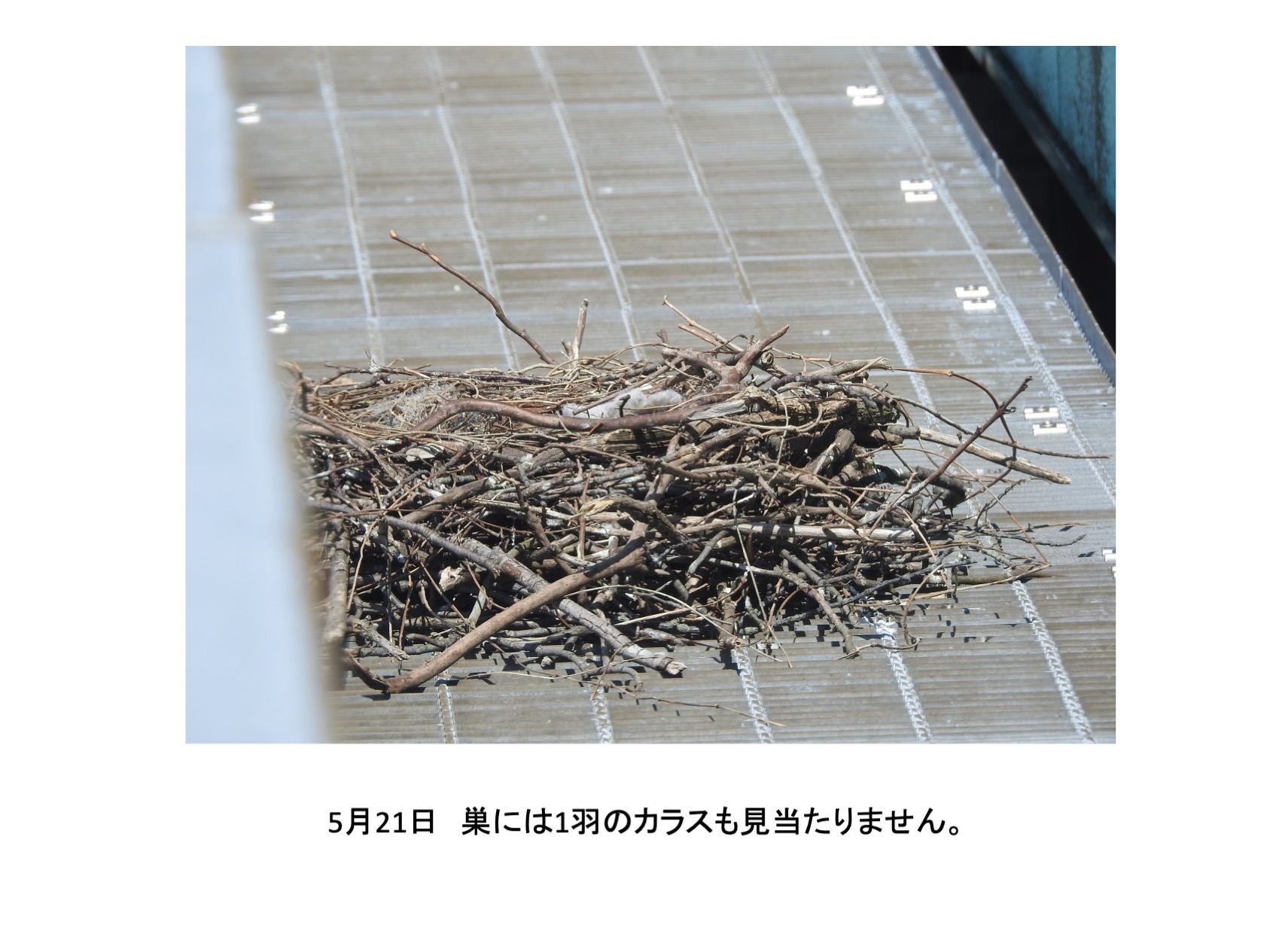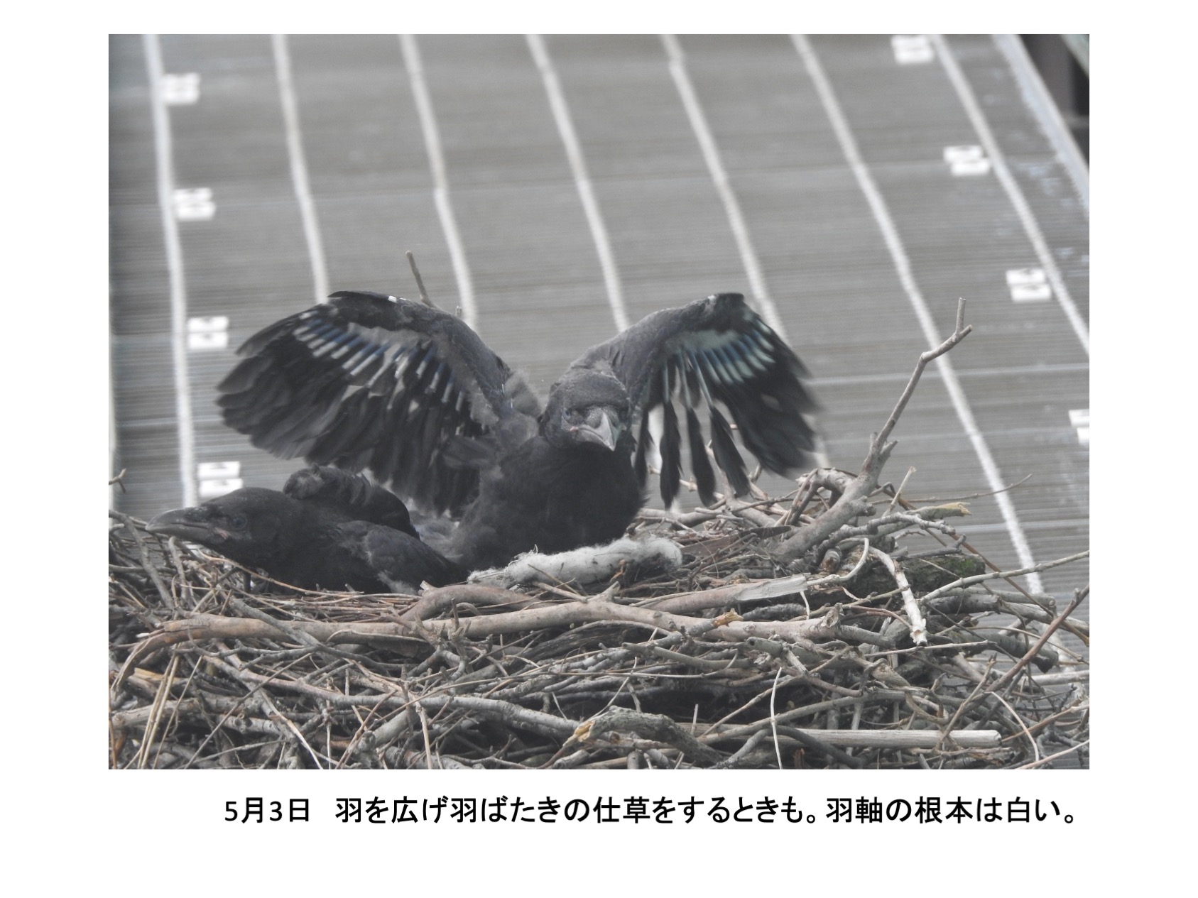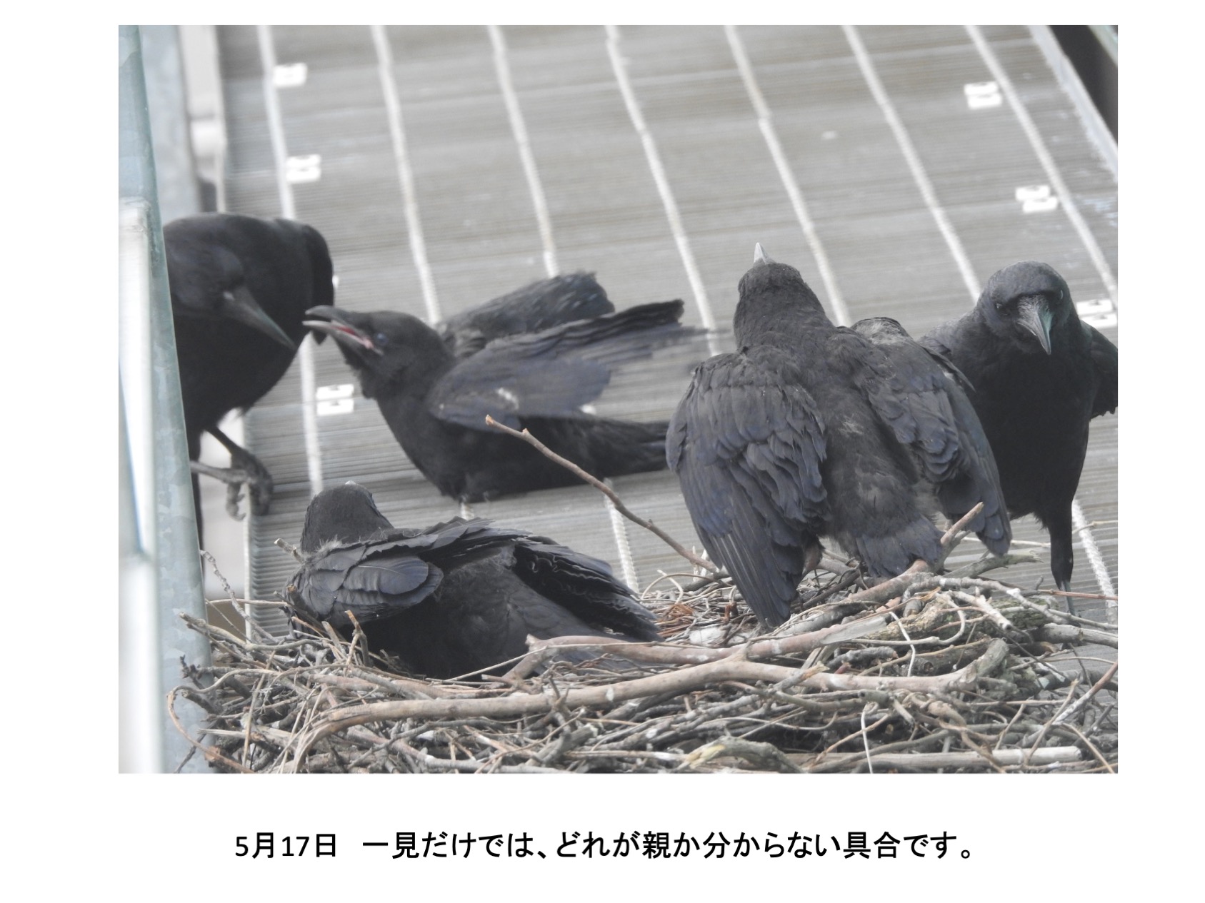 そんな、巣の中に4羽の雛がいました。確認できたのは推定孵化後1週間後くらいからです。巣立ちを期待し数日おきに観察していました。しかし、結果的には、4羽とも巣立ちができませんでした。実は、育ちは順調でしたが、育つにつれ巣から出歩いて全て落下して線路脇で衰弱死という顛末です。活発に巣からでて歩き、下を覗き見る雛を見て落下もしくは飛翔の練習で地面に降り戻れなくなるのではと思っていましたが、予想したとうりでした。高層マンションから幼児が落下する事故がたびたびですが、読み切れないことが起きるのはカラスも人間社会も同じです。