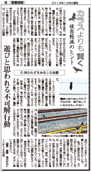 レールの上への置き石という非常に危ない行動もある。ある鉄道会社は、頻発する謎の置き石事件に悩まされていたが、監視カメラを仕掛けてみると、なんと犯人はカラスであった。これは、カラスの貯食と呼ばれる行動が引き起こした事件であった。貯食とは、食べ物を手に入れた際、すぐには食べず隠しておく行動だ。その隠し場所は、木の洞や屋根、街頭スピーカーなど多種多様である。線路に敷かれたバラストの隙間は、食べ物を隠しやすい場所のようだ。ただ、カラスもどこに隠したか忘れてしまう事があるらしい。そのため、目印として石をレールの上に置いたと考えられている。