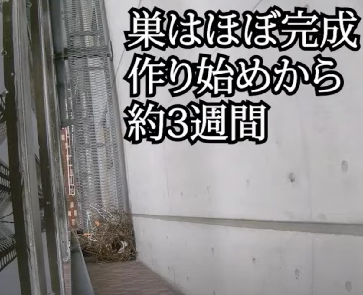 今回の映像では、作り始めからおよそ3週間で巣が完成しました。電力会社さん等では、電気事故の危険がある場合などには巣を撤去することがありますが、その場合には同じ場所やすぐ近くに再営巣することが多く、再営巣の期間は一晩など、非常に短い期間で造られます。突貫工事のため、巣材がボロボロ落ちていることがよくあります。