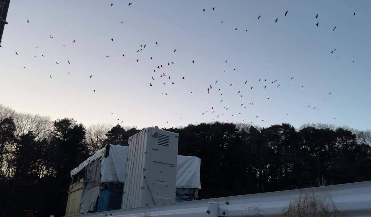 日の入り直前、待ち合わせをするかのごとく、ねぐら付近の高い建物や電線などに短時間滞在し、ある程度の集団になるとねぐらに入る。ねぐらには、市街地近くの丘や公園、神社といった樹木が多い場所が選ばれやすい。一度ねぐらに入っても、新しい集団がねぐら入りするたびに外に飛び出し、大集団でねぐら上空を旋回した後、また戻るなど、出入りを繰り返す(写真はねぐら上空を旋回するカラスの集団)。日の入り後30分程度で落ち着き、その後は朝まで大きな動きはない。これがカラスの一日だ。
