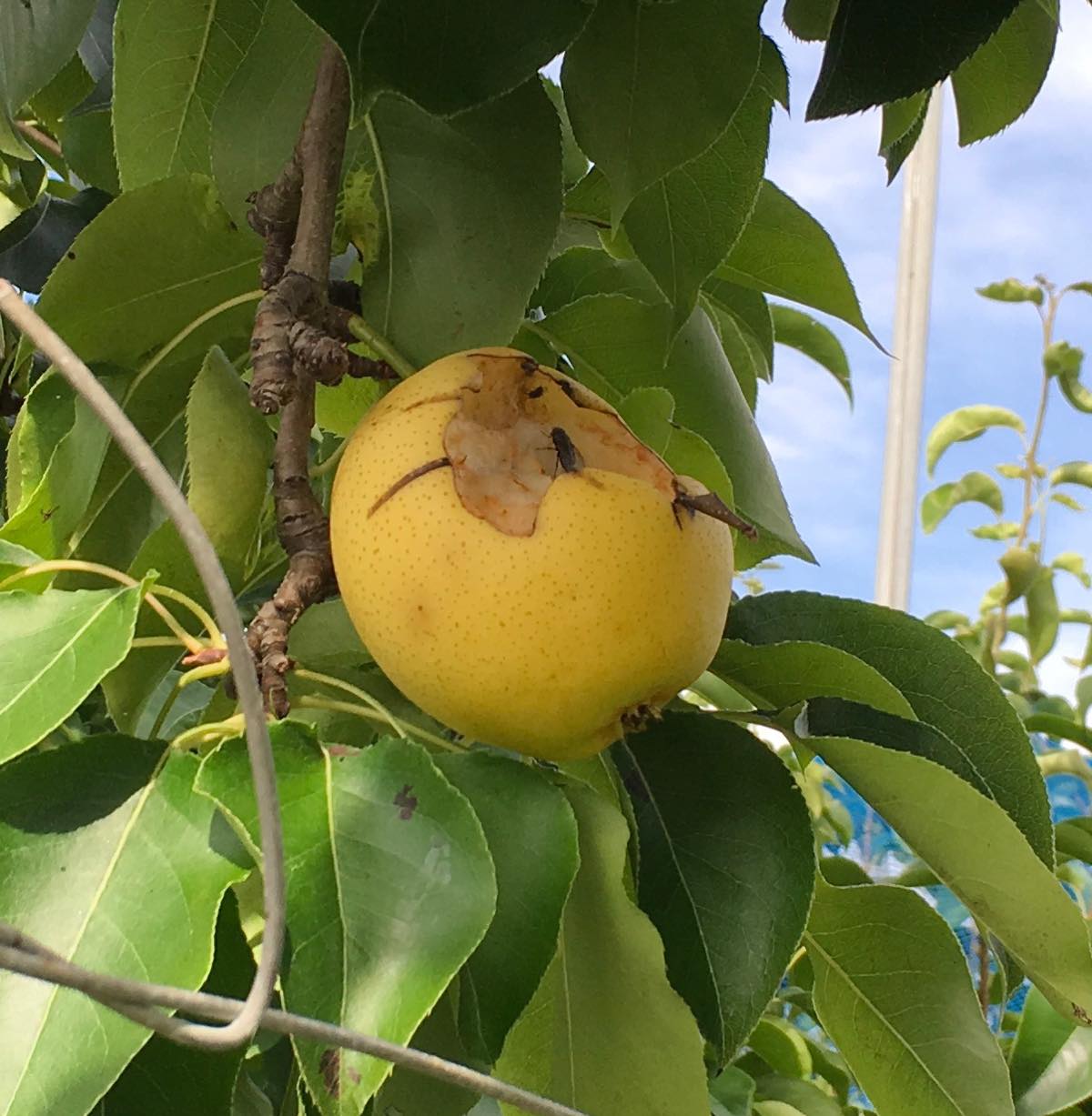 農作物の食害、家畜感染症の伝播など、農業現場でカラスがもたらす被害は大きい(写真はカラスに突かれたリンゴ)。ヒトからすれば被害だが、カラスとしては単に食べ物を求めただけである。これはある意味、カラスとヒトとの間の摩擦とも言える。