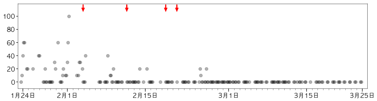 グラフは、カメラによる定点観察を行ったある電線に止まっていたカラスの羽数の変化を示します。横軸は日付、縦軸はカラスの羽数です。グレーのドットはその日のある時刻(18:00, 19:00, 20:00, 21:00, 22:00)に観察されたカラスの羽数を示しています(カメラ映像から羽数のカウントが困難な場合は欠損値として扱い、グラフには反映してません)。赤矢印は音声を再生した日です。