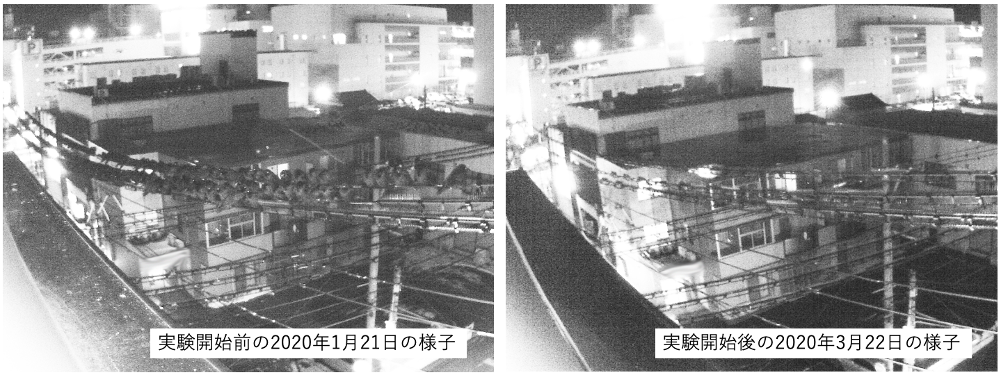 実験は、市内でも集中的な糞害が確認される中心街の1ブロック(4ha程度)にて行いました。2020年2月4日に1回目の音声による追い払いを行い、その後、2月中に3回実施しました。3月に入ると、カラスの飛来がほとんど見られなかったことから、追い払いは実施しておりません。カラスの飛来の様子は定点カメラで撮影し、夜間の飛来数をカウントしました。