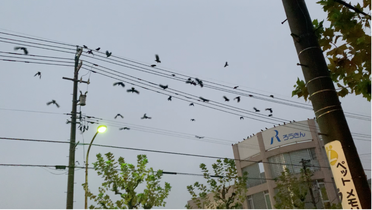 とは言っても、ねぐら周辺ではひどい糞害に悩まされることがあります。カラスはねぐらに入る前に一時的に集まる「就塒前集合」という行動をします。ねぐら付近の電線や建物などに集まってから、ある程度の数になったところでねぐらに入っていきます。そのため、電線の下などでは糞害が発生します。このような被害に対しては、局所的な対策が有効です。被害が発生する道路の電線や建物などにおいて、別の場所へと移動を促す方法です。レーザーポインターやライトなどで追い払う対策が実施されておりますが、一旦離れるものの、すぐに戻ってきてしまうことが多いようです。