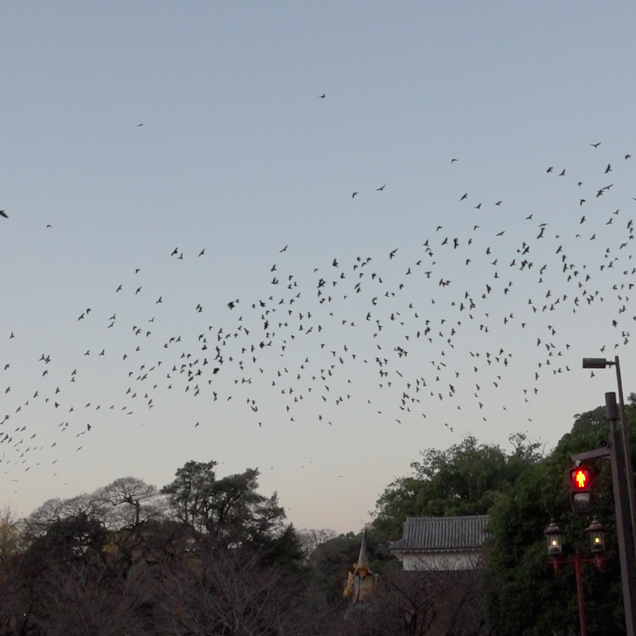 熊本市では、冬になるとカラスが市街地をねぐらにしていました。熊本市の場合、四季を通じて生息する留鳥のハシブトガラスとハシボソガラスの他、冬には越冬のために大陸から渡ってくるミヤマガラスという種が混在しているのが特徴です。冬の熊本市の中心市街地は大量のミヤマガラスで埋め尽くされます。ミヤマガラスは集団で行動する習性があり、その分、ふん害も目立ちます。熊本市では、これまで、ライトによる追い払いを実施していましたが、一時的にしか追い払えず、糞害の軽減には至りませんでした。