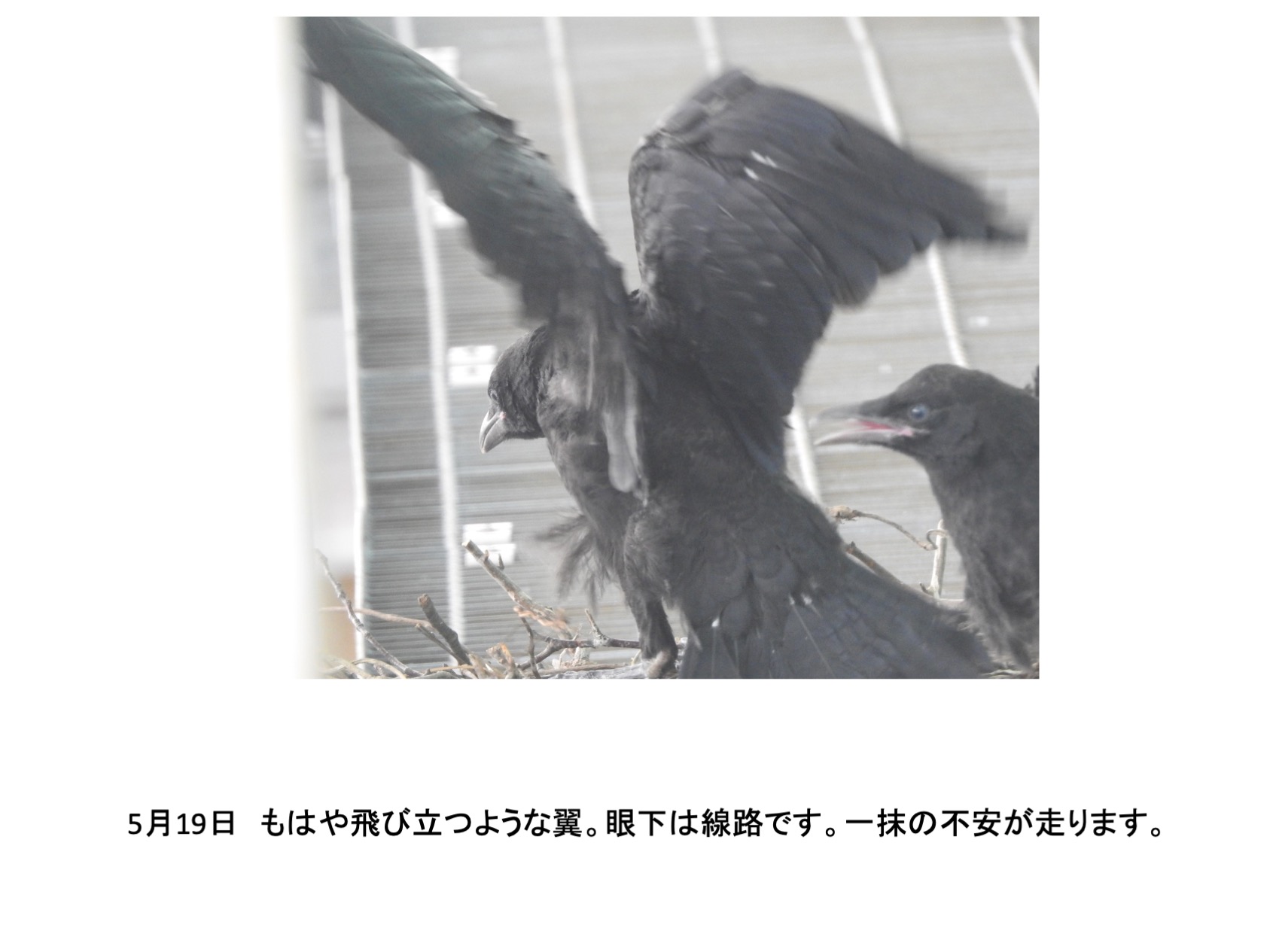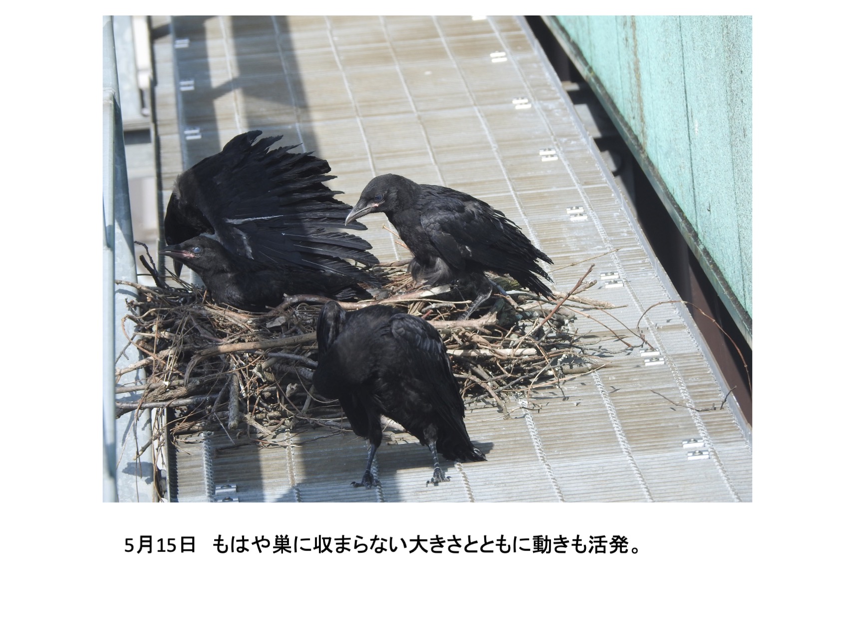 そんな、巣の中に4羽の雛がいました。確認できたのは推定孵化後1週間後くらいからです。巣立ちを期待し数日おきに観察していました。しかし、結果的には、4羽とも巣立ちができませんでした。実は、育ちは順調でしたが、育つにつれ巣から出歩いて全て落下して線路脇で衰弱死という顛末です。活発に巣からでて歩き、下を覗き見る雛を見て落下もしくは飛翔の練習で地面に降り戻れなくなるのではと思っていましたが、予想したとうりでした。高層マンションから幼児が落下する事故がたびたびですが、読み切れないことが起きるのはカラスも人間社会も同じです。