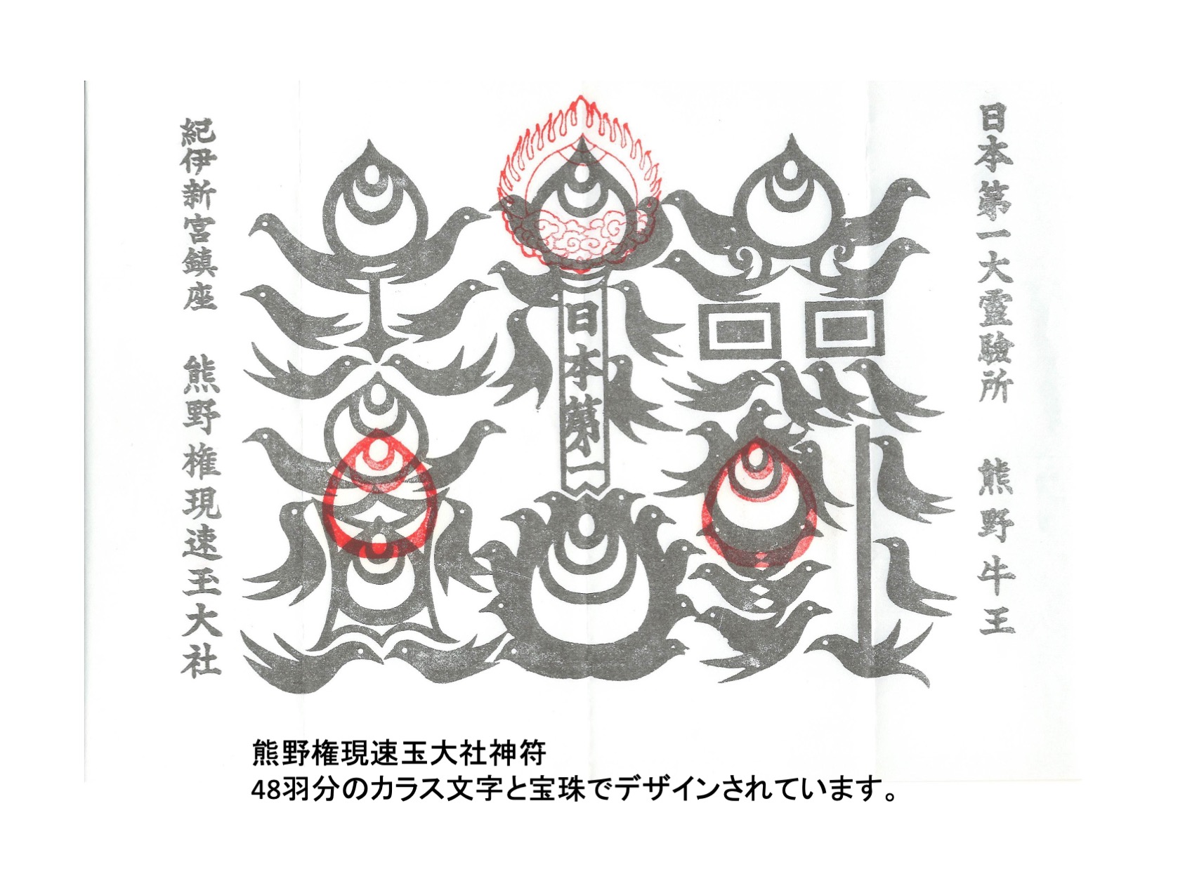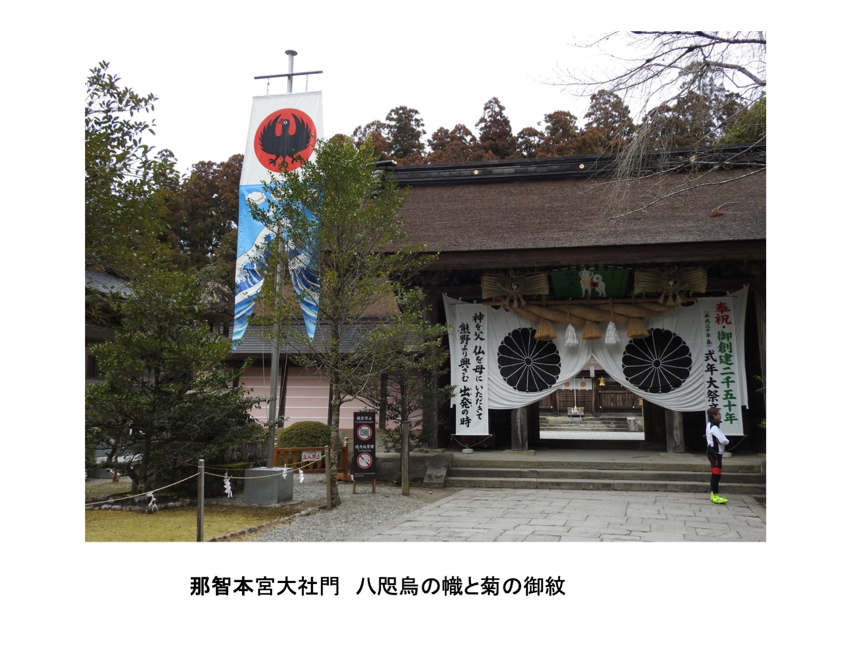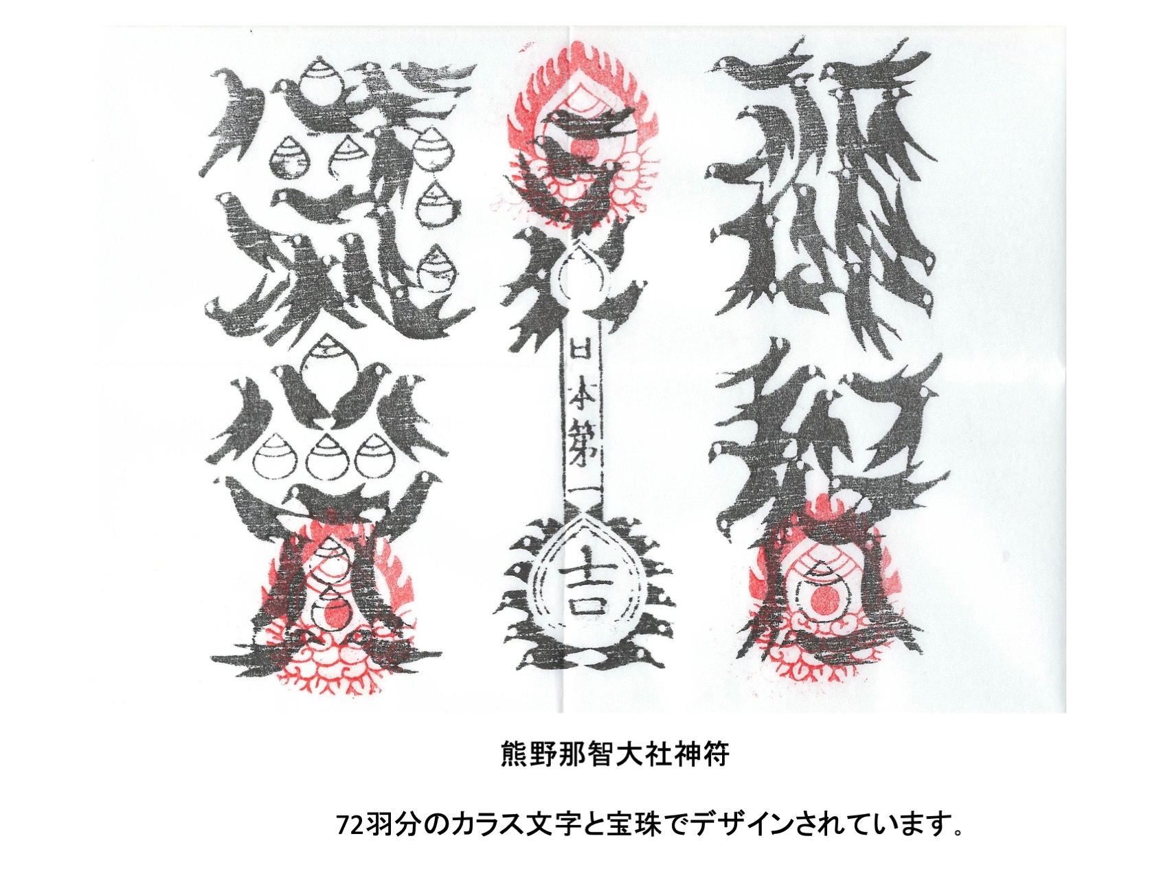 私の推察は別としても、このようにカラスは本来、神の遣いとして信仰され、日本では祀っている神社も多いのです。その本山とも言うべき存在は、和歌山県の熊野本宮大社、熊野速玉大社、熊野那智大社などがそうです。世界遺産熊野古道に繋がります。境内の建造物や簾などの八咫烏が描かれていたり彫られています。こうした神社では、カラス絵や独特のカラス文字が入ったお守り、ご朱印を参拝者に配っています。さて、2018年3月、カラスを研究しているなら一度はと思い那智本宮大社、那智速玉大社、那智大社を尋ねました。