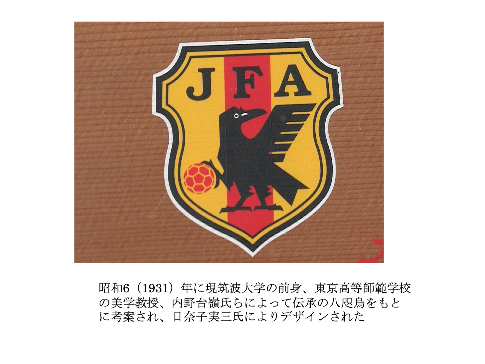 日本サッカー協会の三本足のカラスのエンブレムは昭和6(1931)年に現筑波大学の前身、東京高等師範学校の美学教授、内野台嶺氏らによって伝承の八咫烏をもとに考案され、日奈子実三氏によりデザインされたようです。この仮想のカラスは、中国神話に伝わる「三足烏(サンズゥウー)」は太陽を象徴する三本足のカラスで吉兆をもたらすと考えられています。日本にも「八咫烏」という名で伝わっています。なお咫は親指と中指を広げた長さで八咫はその八倍になる大きさになるので、八咫烏は大きな鳥というイメージになります。